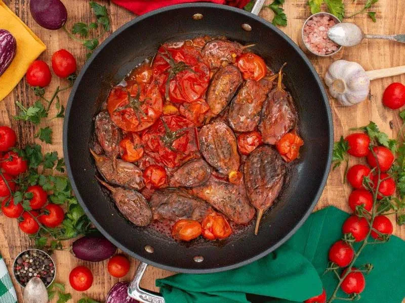 بادمجانها را سرخ یا کبابی کن. پیاز را تفت بده، گوجه را اضافه کن، بعد بادمجان. نمک و فلفل بزن و بگذار مزهها یکی شوند. غذای کلاسیک نانخور.