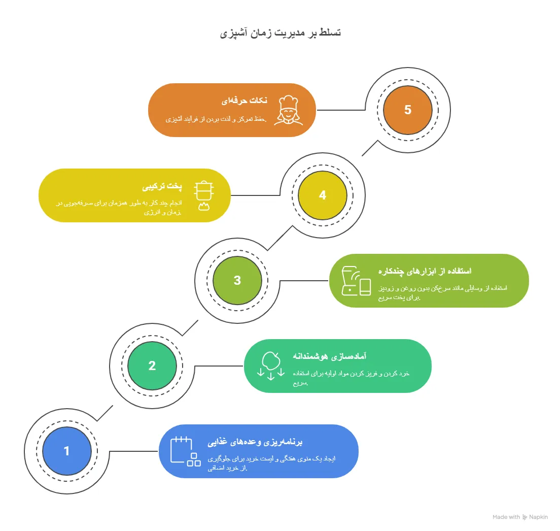 با برنامهریزی وعدهها، آمادهسازی مواد اولیه از قبل و استفاده از وسایل چندمنظوره.