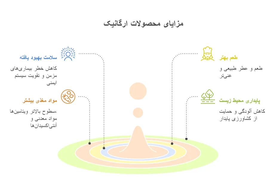 محصولات ارگانیک برویم؟ محصولات ارگانیک به محصولاتی گفته میشود که در تمام مراحل تولید، از کاشت تا برداشت و فرآوری، بدون استفاده از کودهای شیمیایی، سموم دفع آفات، هورمونها یا مواد نگهدارنده مصنوعی تولید میشوند. این محصولات نهتنها سرشار از مواد مغذی هستند، بلکه عاری از مواد شیمیایی مضر بوده و به سلامت خاک، آب و اکوسیستم کمک میکنند. تحقیقات نشان دادهاند که مصرف محصولات ارگانیک میتواند به تقویت سیستم ایمنی، کاهش خطر بیماریهای مزمن و حتی بهبود طعم غذاها منجر شود.