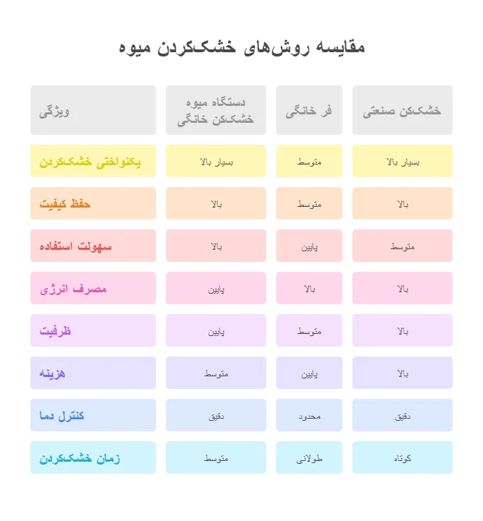 فر خانگی: در نبود دستگاه خشککن، میتوان از فر استفاده کرد. دمای مناسب بین ۵۰ تا ۶۰ درجه سانتیگراد است. لازم است میوهها با فاصله روی سینی چیده شده و در بازههای زمانی منظم جابهجا شوند.