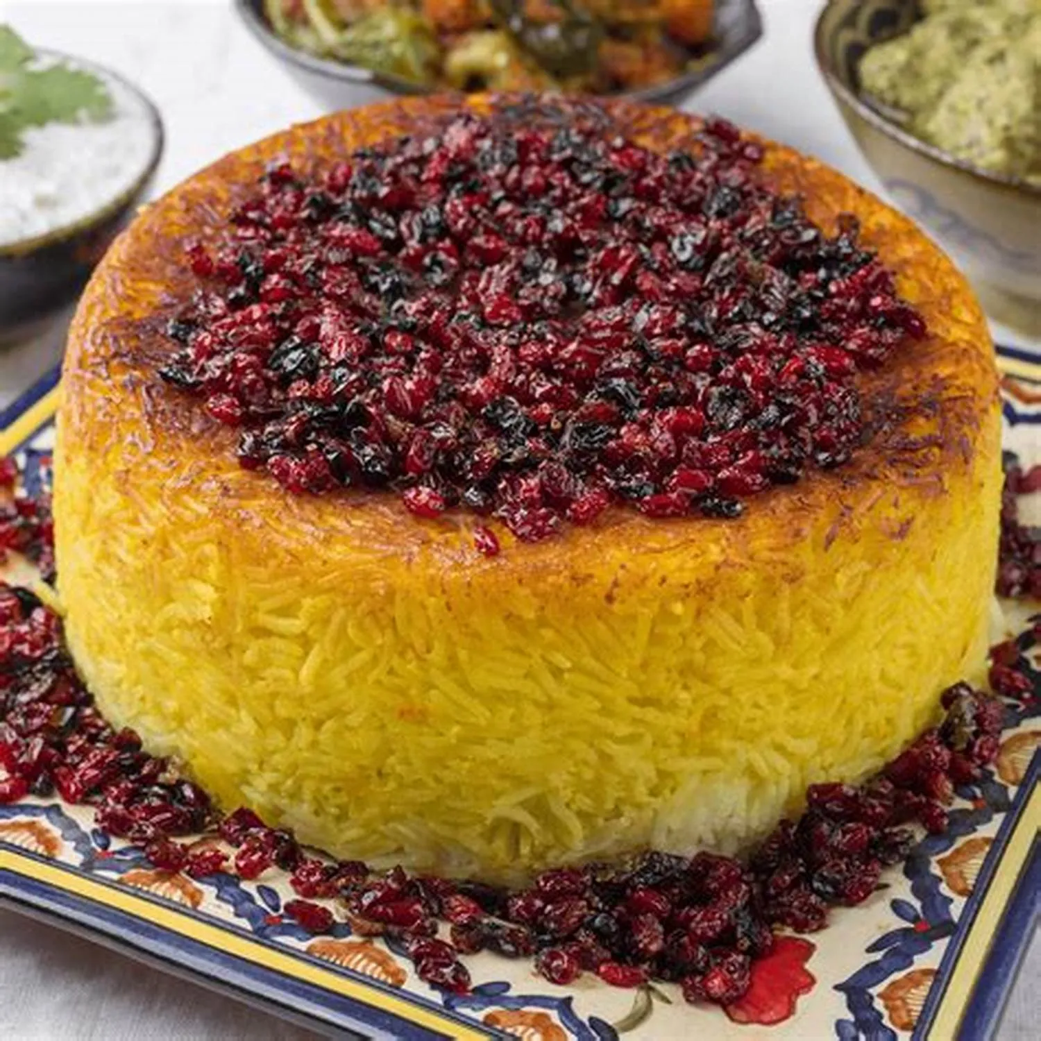 7. زرشک و تزئین: در یک تابه کوچک، زرشک را با کمی روغن و شکر تفت دهید تا نرم و براق شود. پس از آماده شدن ته چین، آن را برگردانده و زرشک را روی آن بریزید.