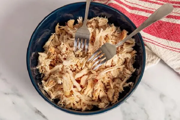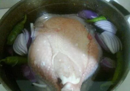 2. پخت مرغ: مرغ را در یک قابلمه با مقداری آب و نمک و پیاز و یک چوب دارچین بپزید. پس از پخته شدن، آن را ریش ریش کرده و کنار بگذارید.