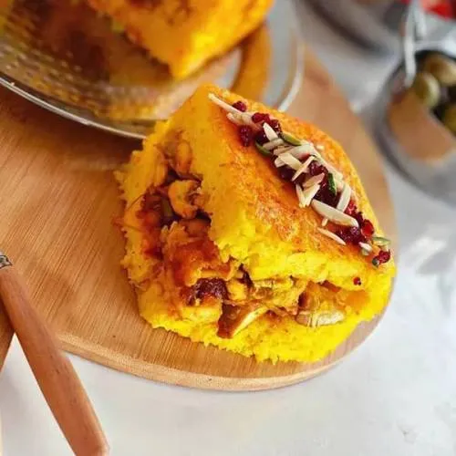 - تزئین با خلال بادام و پسته: برای زیبایی بیشتر و اضافه کردن طعم، تهچین را با خلال بادام و پسته خلالی تزئین کنید. همچنین، از زرشک هم برای زیبایی و طعم اضافه استفاده میشود.