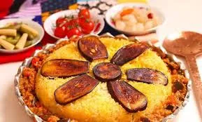 لایهای برنج، لایهای گوشت و بادمجان بچینید.
