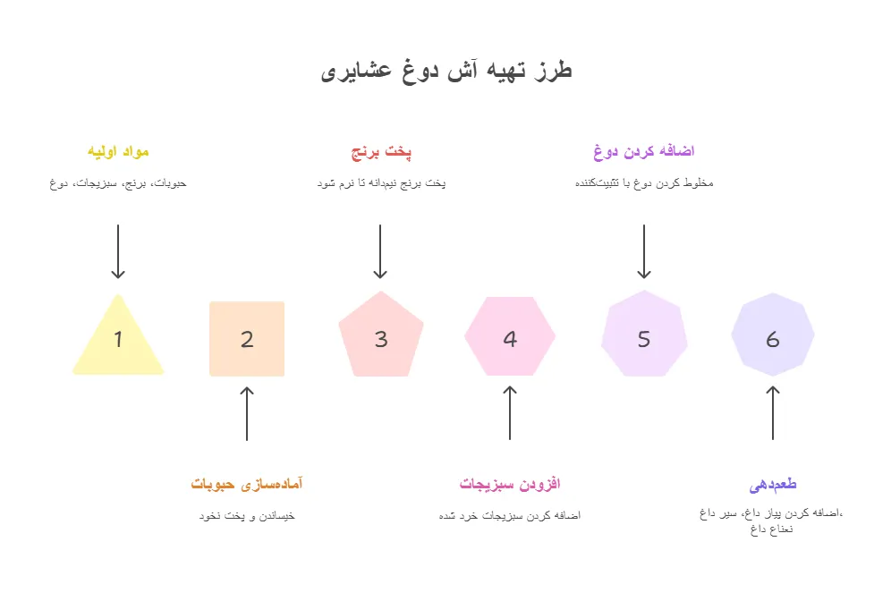 پخت آش دوغ عشایری، فرایندی است که نیاز به صبر و دقت دارد، درست مانند زندگی عشایری که با آرامش و هماهنگی با طبیعت پیش میرود. در ادامه، مراحل پخت این غذای سنتی را با جزئیات شرح میدهیم:
