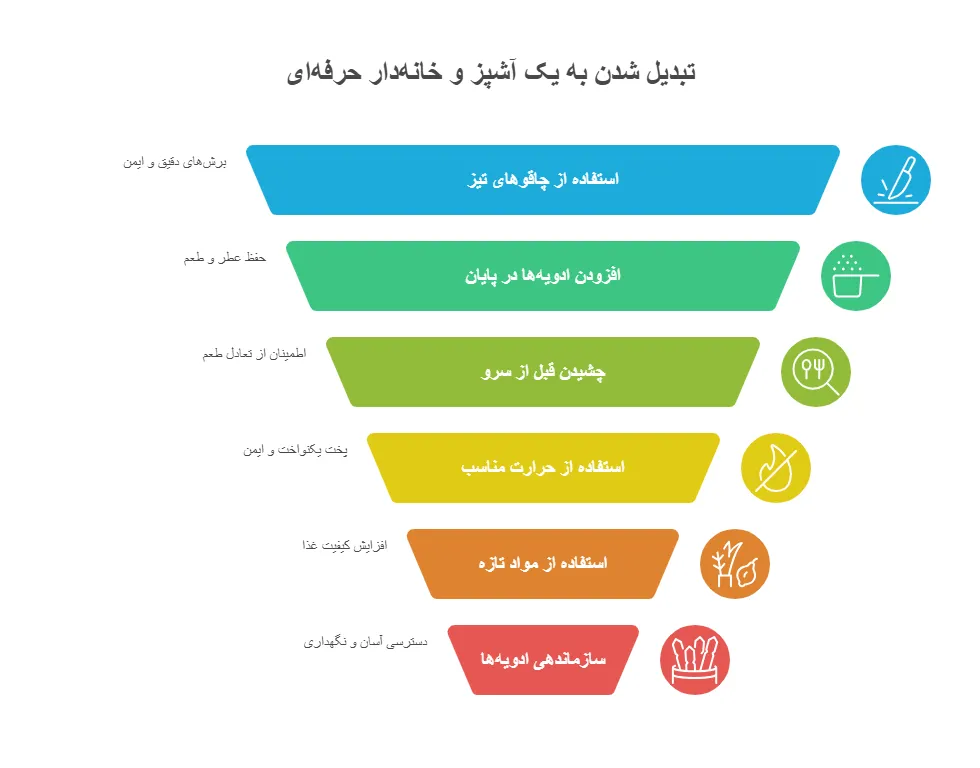آشپزی هنری است که با تمرین و استفاده از ترفندهای مناسب، میتوان در آن به مهارت بالایی دست یافت. در این بخش، به برخی از مهمترین ترفندهای آشپزی اشاره میکنیم: