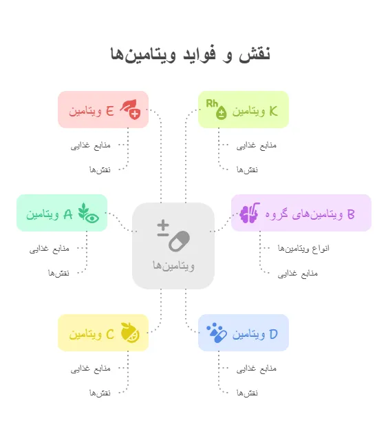 ویتامینها ترکیبات آلی هستند که در بدن ذخیره نمیشوند و باید به صورت منظم از طریق غذا دریافت شوند. انواع مختلف ویتامین نقشهای ویژهای دارند: