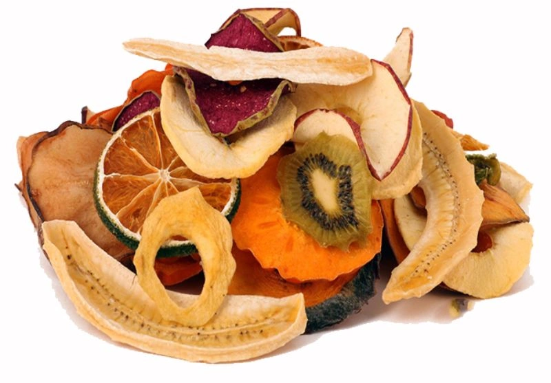 مثلاً موز خشک: هر ۱۰۰ گرم، ۳۵۸ کالری، ۲.۹ گرم پروتئین و ۸۹ گرم کربوهیدرات دارد. پتاسیم آن (۱۴۸۰ میلیگرم) فشار خون را کنترل میکند. آناناس خشک، با بروملین، به هضم کمک میکند و آنتیاکسیدانهایش التهاب را کاهش میدهد.